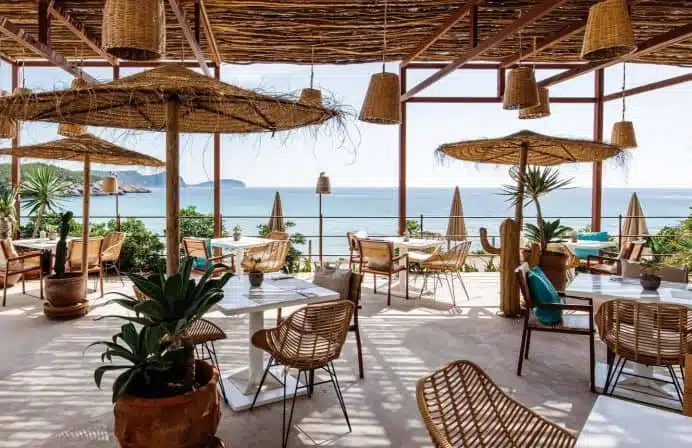 Amante à Sol d’en Serra est perché sur les falaises dans une crique confidentielle, accessible uniquement par un chemin étroit depuis la route. Le cadre est objectivement parmi les plus beaux de toute la Méditerranée : une baie protégée aux eaux turquoises, des falaises blanches, des oliviers. L’ambiance est à l’opposé d’Ibiza clichée — pas de musique assourdissante, pas de gogos, juste un déjeuner gastronomique face à la mer dans un silence presque irréel pour l’île.